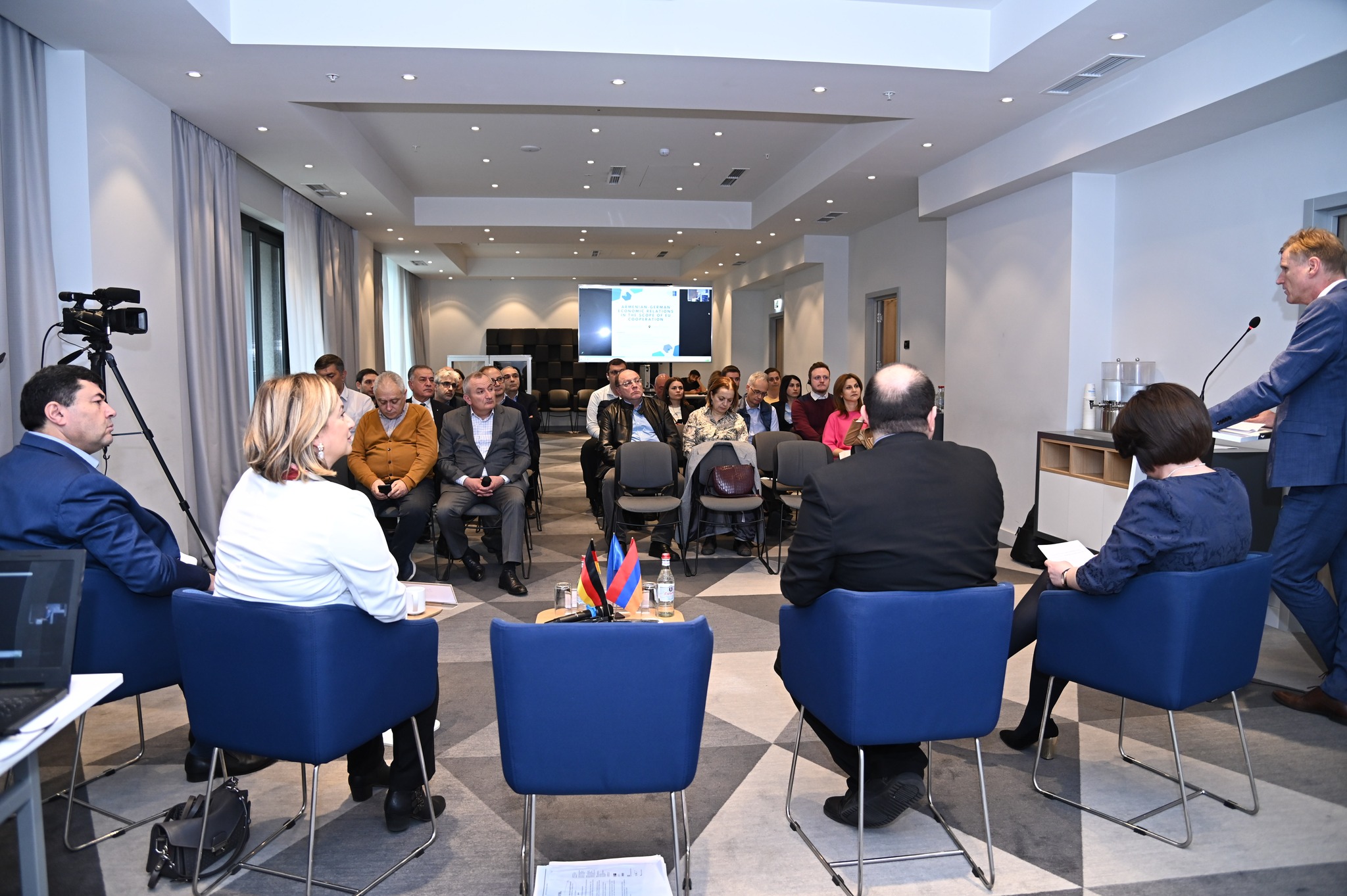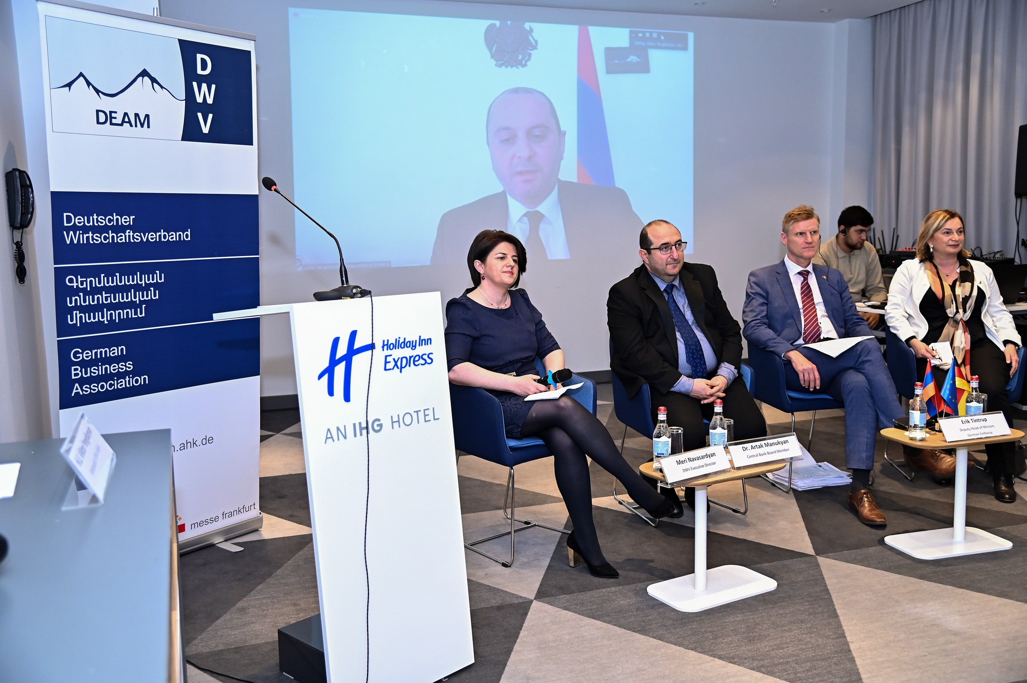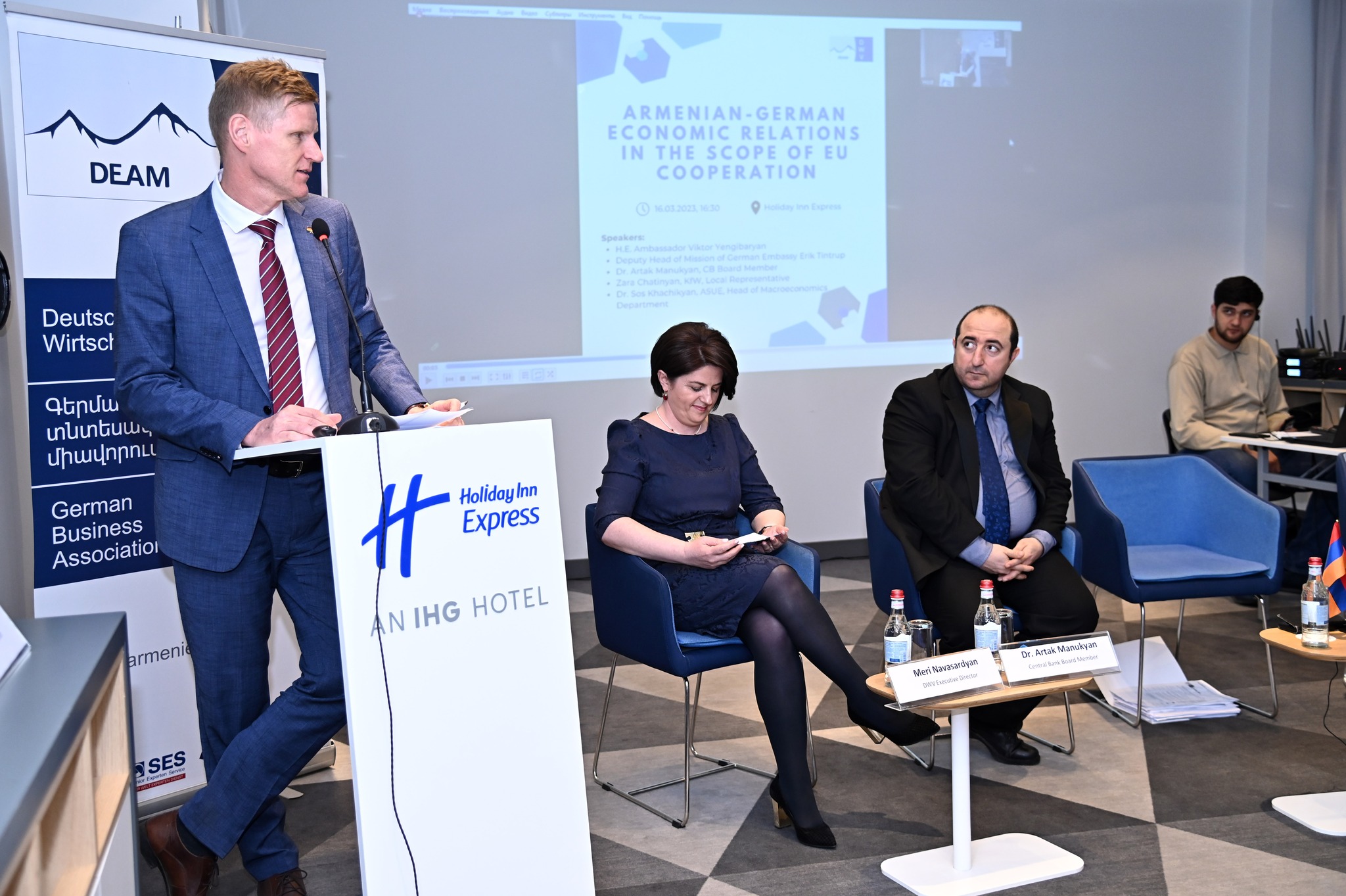 Am 16. März fand auf Initiative des Deutschen Wirtschaftsverbandes die Veranstaltung „Deutsch-armenische Wirtschaftsbeziehungen im Rahmen der Zusammenarbeit mit der EU“ statt. Während der Veranstaltung, die von Frau Meri Navasardyan, der Geschäftsführerin des Deutschen Wirtschaftsverbandes, geleitet wurde, sprachen die Redner über die wirtschaftliche Lage Armeniens und Deutschlands und über die Zusammenarbeit zeischen beiden Ländern. Frau Meri Navasardyan begrüßte die Gäste und eröffnete die Veranstaltung. Der stellvertretende Botschafter Erik Tintrup sprach über die politische und wirtschaftliche Lage Armeniens sowie über die Zusammenarbeit zwischen Armenien und Deutschland. Herr Artak Manukyan, der Vorstandsmitglied von der zentralen Bank Armeniens, präsentierte interessante statistische Daten zur wirtschaftlichen Lage Armeniens und diskutierte auch mögliche Ursachen und Auswirkungen des Wirtschaftswachstums. Frau Zara Chatinyan, die lokale Vertreterin der KfW in Armenien, berichtete über die deutsche finanzielle Zusammenarbeit, EU-Investitionen, Großprojekte, die von der KFW durchgeführt wurden, sowie über bevorstehende Projekte.